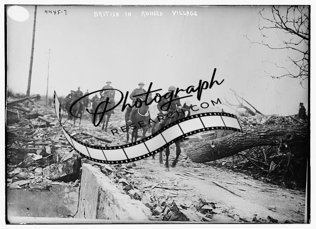 British in ruined village,men on horseback,Bain News Service,military