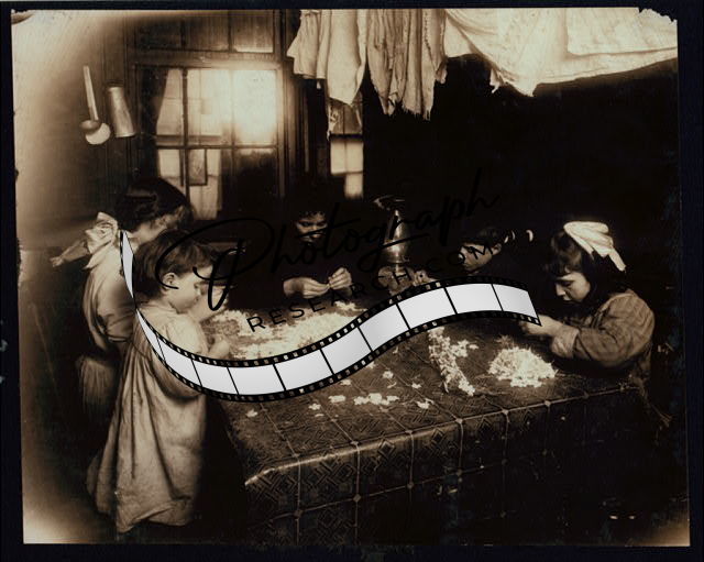 Title: 5 P.M. Making dolls legs for Campbell Kids. Cattena family, 71 Sullivan St., 5[th] floor front. As soon as the photo was taken, Rose carried the box full of finished legs to the Aetna Doll and Toy Co, (whose name was on the box). Tessie, (on the right) lives down stairs and does this work there. Was helping here. Rose is 14 yrs. old. Lena, (deformed), is 12, Nettie, 9 yrs. old is very deft. They all work after school and often until 10 P.M. Location: New York, New York (State)
