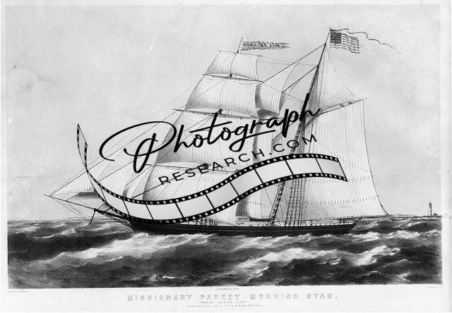 Missionary packet Morning Star - passing Boston Light,ship,vessel,American flag