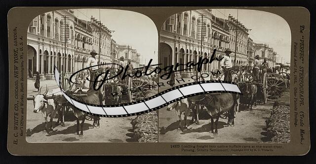 Loading freight into native buffalo carts at the water-front, Penang, Straits Se