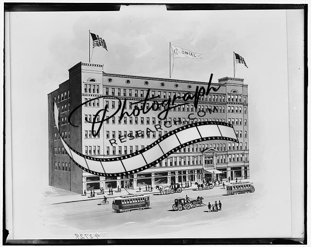 Colonial Hotel,buildings,street cars,carriages,flags,Cleveland,Ohio,OH,1900