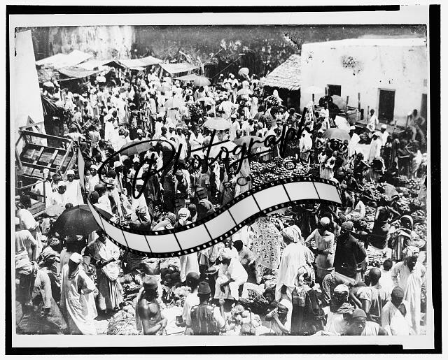 Fruit market at Zanzibar,East Africa,1890-1923,crowd of people,umbrellas,food