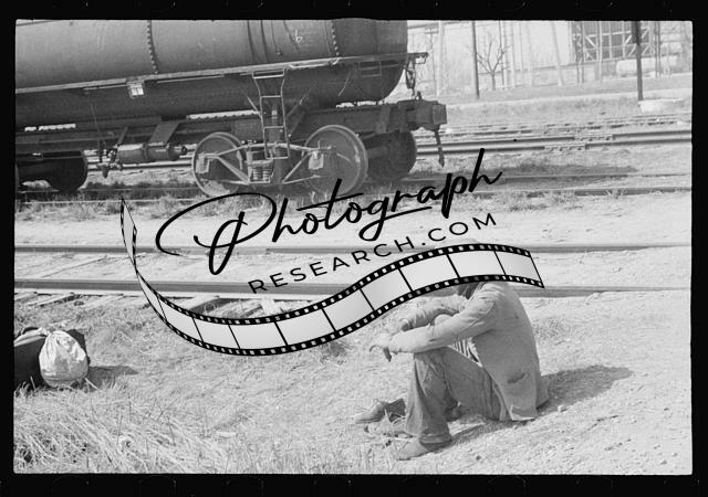 Man seated by train tracks,Railroad,RR,Farm Security Administration,FSA,3