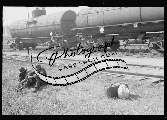 Man seated by train tracks,Railroad,RR,Farm Security Administration,FSA,3