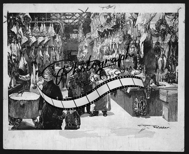 Photograph of a 1882 wood shows customers in a butcher's shop