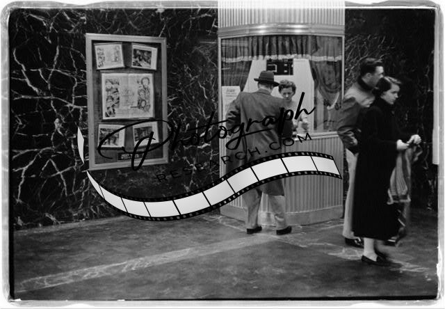 Man purchasing movie ticket,woman in ticket booth,couple,February 9,1958,Theater