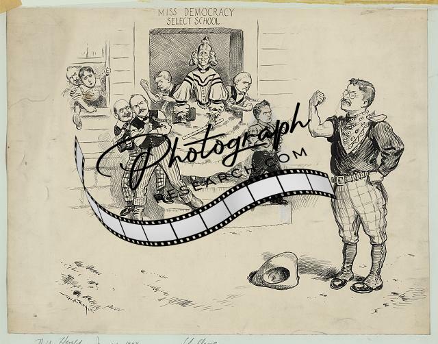 Challenge,William Allen Rogers,1904?,Theodore Roosevelt,Dame Democracy,Fighting