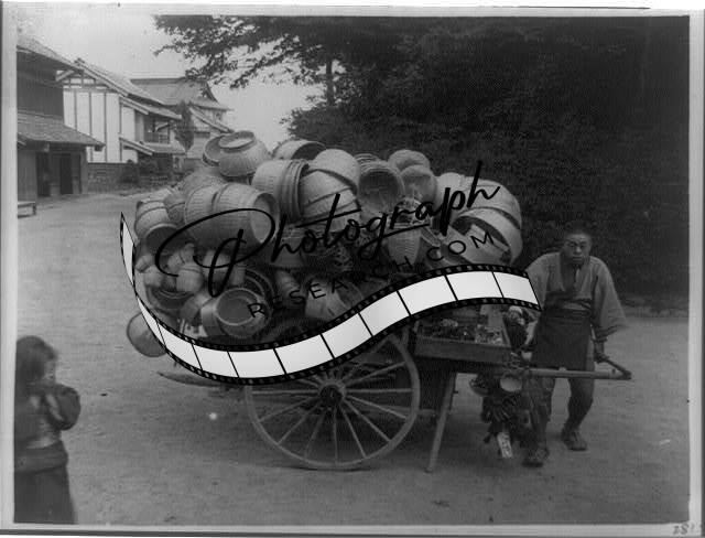 Travelling Basket Vendor,Man w/ cart full of baskets,Japan,1915-1925