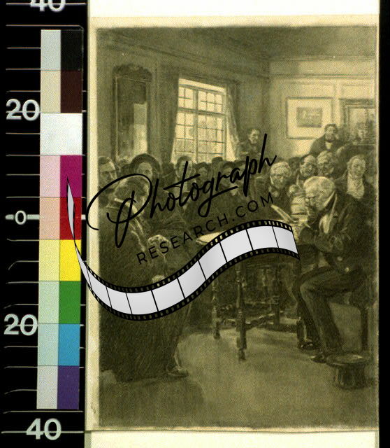Crowd of people around table watching man read document,Alice Barber Stephens