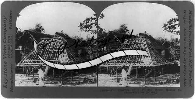 Building of a Filipino house,making the framework for the roof,December 12,c1912
