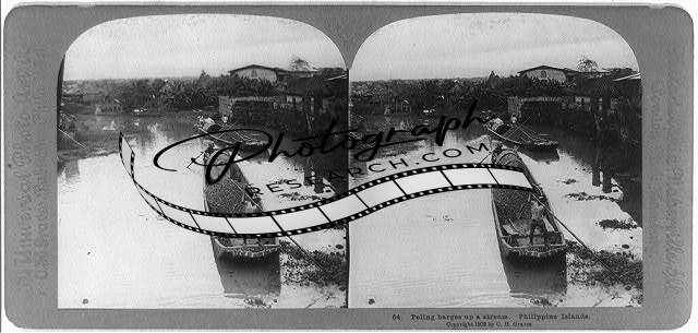 Poling barges up a stream,1902,boats on water,photograph