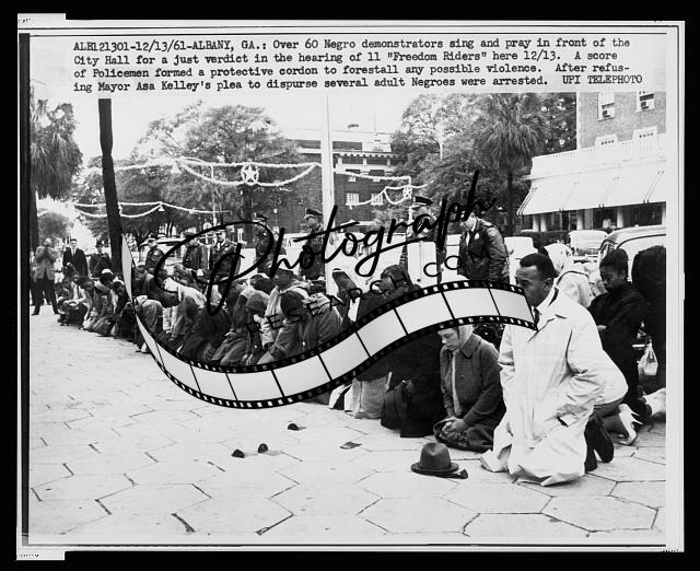 More than 60 demonstrators kneeling before city hall in support of the eleven "Freedom Riders" on trial, with policemen in background in Albany, Georgia