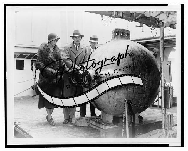 Photograph shows Dr. William Beebe (center) standing with two assistants, Miss Gloria Hollister and John Tee-Van, next to the bathysphere.