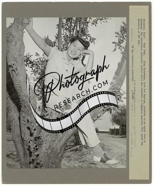Manzanar, Calif. June 1942. Kinu Hirashima, from Los Angeles, perching in an app