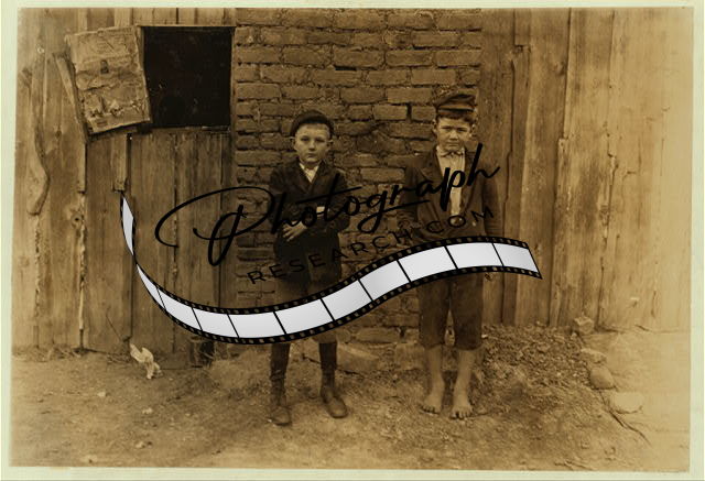 Title: In neighborhood of Maple Mill, Dillon, S.C. Lawrence Faircloth (taller boy) 'Don't know how old I am.' Been in mill 2 years. Runs 3 sides Albert Bartlett (barefoot) Looked 8 years old. In mill 2 years--Beginning to spin. Runs 2-1/2 sides = 25 cents a day. Bad conditions. Saturday, Dec. 5, 08. Location: Dillon, South Carolina / Photo by Lewis W. Hine.