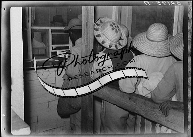 Title: Negro day laborers brought in truck from nearby towns, waiting to be paid off for cotton picking and buy supplies inside plantation store on Friday night. Marcella Plantation. Mississippi Delta. Mississippi