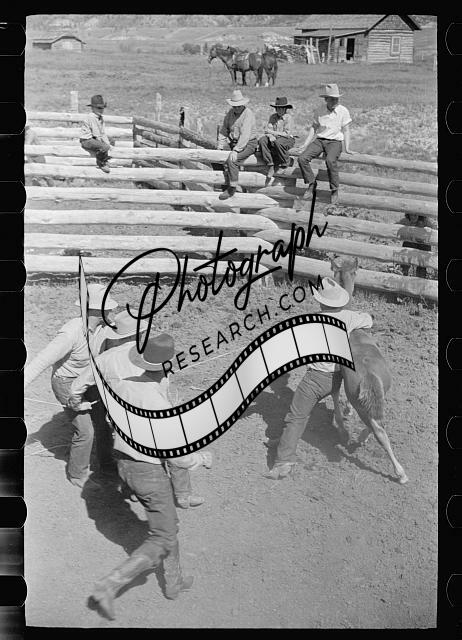 Branding a colt,Quarter Circle U roundup,Montana,MT,June 1939,Rothstein,FSA 1