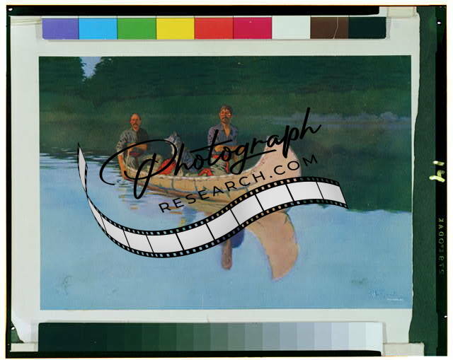 Two men and a dog in a canoe / Frederic Remington. 1908
