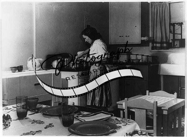 Housewife preparing dinner,compact kitchen,women,Greenbelt,Maryland,MD,1940