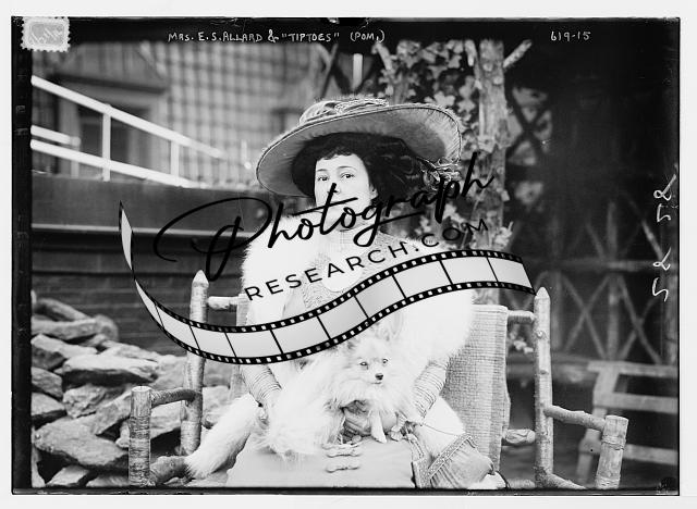 Mrs. E.S. Allard with Pomeranian dog ('Tiptoes') on lap,animal,woman