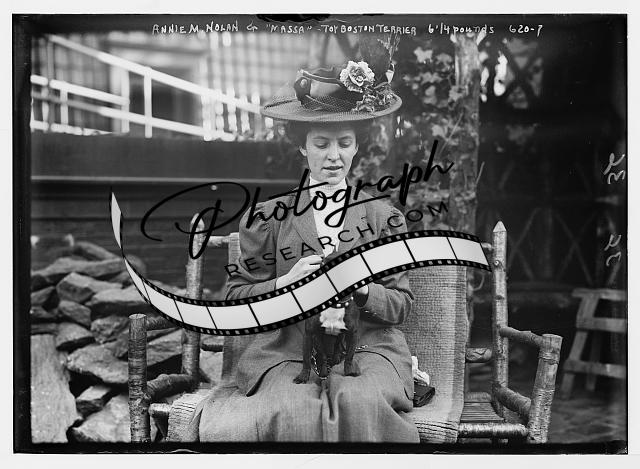 Annie M. Nolan with her toy Boston Terrier,'Massa',bench
