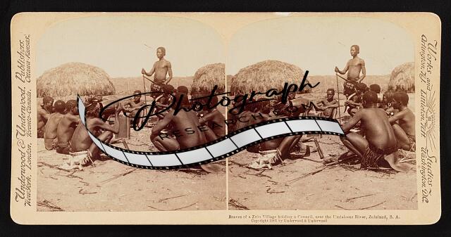 Braves of a Zulu village holding a council, near the Umlaloose River, Zululand,