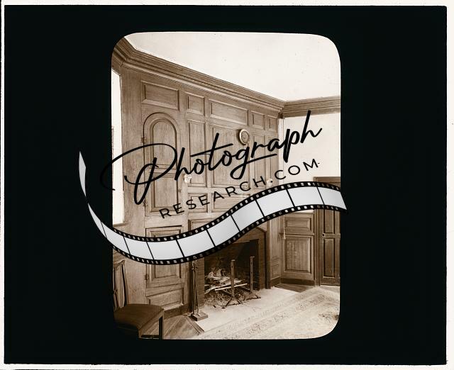 Summary: Photo shows Carter Grymes House, interior with fireplace and open cupboard containing glass and metal dinnerware.