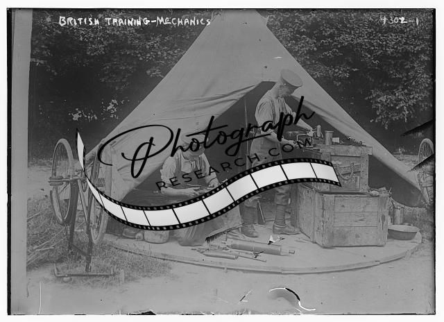 British training mechanics,Men working,tent,bicycle,Military,Bain News Service
