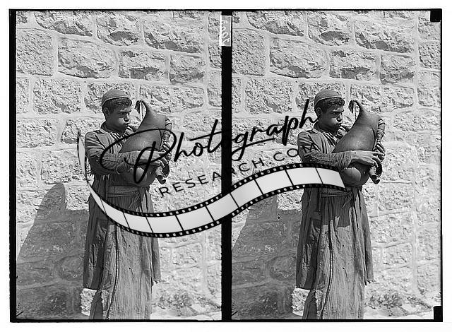 Young Bedouin man blowing bagpipe instrument,Nomadic Arab,Middle East,1898-1946