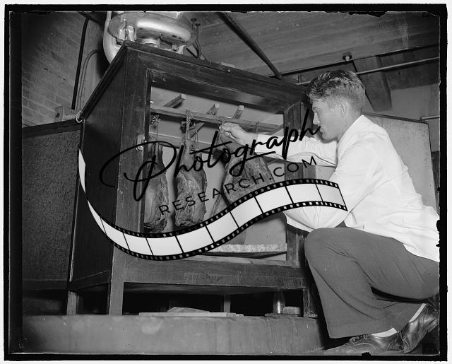 Title: Hams now aged in 6 to 10 weeks. College Park, Md. Oct. 27. No longer is it necessary to age ham a year or so to obtain that sharp, pungent, cheesy flavor in the lean meat, so characteristic of southern style ham. Speeding up nature, the Maryland Experiment Station, University of Maryland, in cooperation with the U.S. Department of Agriculture, has developed a process by which it is possible to produce some of these characterisitc flavors in hams in relatively short time--6 to 10 weeks--by holding them at temperatures from 107 F to 125 F in specially constructed incubator. 1. The first step in the process is the thorough curing of the hams, three days being allowed for each pound of ham being cured. Mr. F.D. Carroll, of the Maryland Experiment Station, is shown with a few of the hams after they have been cured