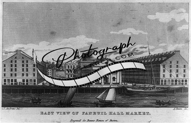 East View,Fanueil Hall Market,boats on water,Boston,Massachusetts,1810-1850