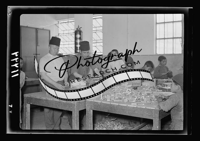 Title: Arab factories & gen[eral] improvements in Nablus. Match factory. Labeling match boxes by machines
