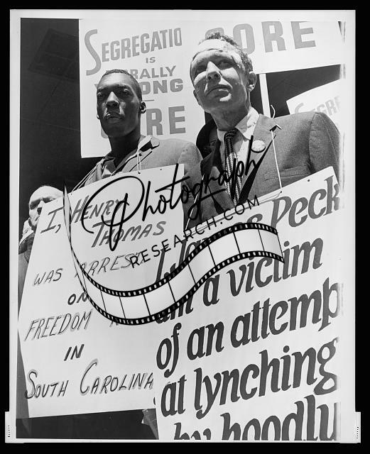 Freedom riders James Peck, head bandaged, with Henry Thomas, each wearing a placard, picketing outside the New York City Port Authority Trailways bus terminal