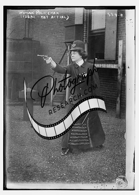 Policewoman posing with pointed gun,bobby stick,in uniform