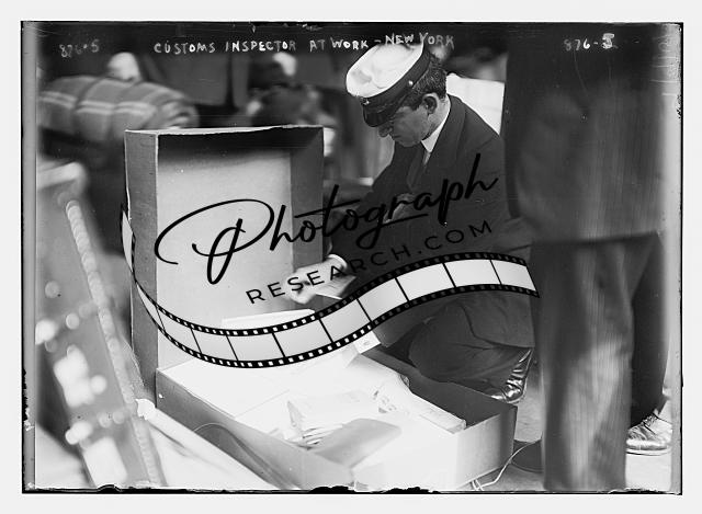 Customs officer inspecting opened luggage,N.D.L. pier,New York,NY,1909