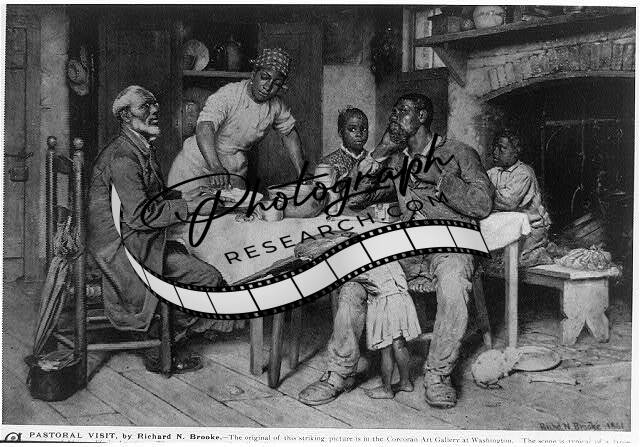 Pastoral Visit,African American family,clergyman,kitchen table,fireplace
