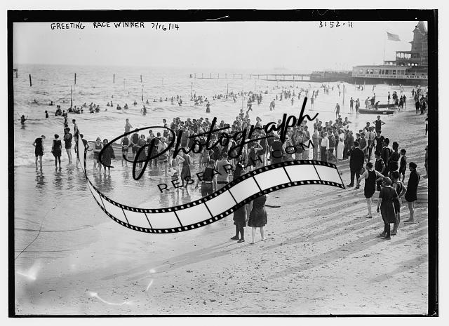 Greeting race winner,July 16,1914,swimming,swimmers,beach,people,bathing suits