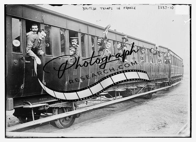 British troops in France,train,men,locomotive,smiling,waving from windows