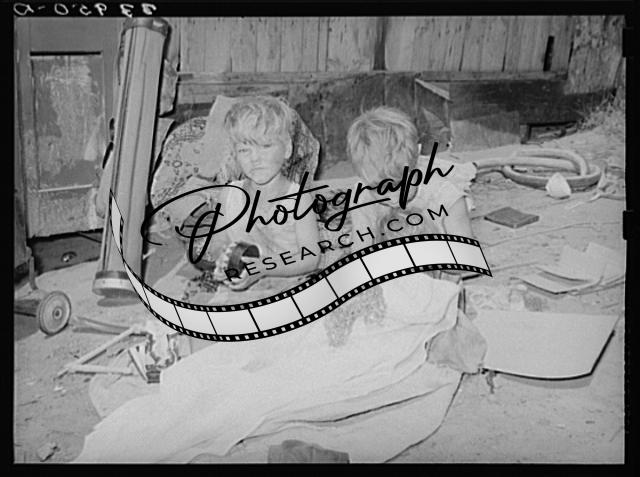 Title: Children on bed inside of shack home in Mays Avenue camp. Oklahoma City, Oklahoma