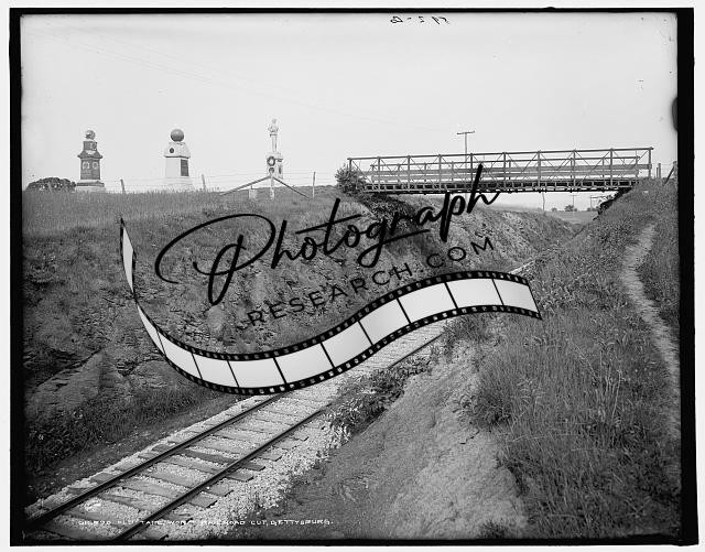 Old tape-worm railroad cut,battlefield,bridge,tracks,building,Gettysburg,PA,1900