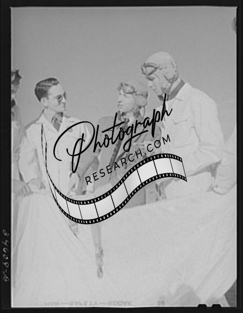 Title: Instructor explaining operation of parachute to student pilots. Meacham Field, Fort Worth, Texas