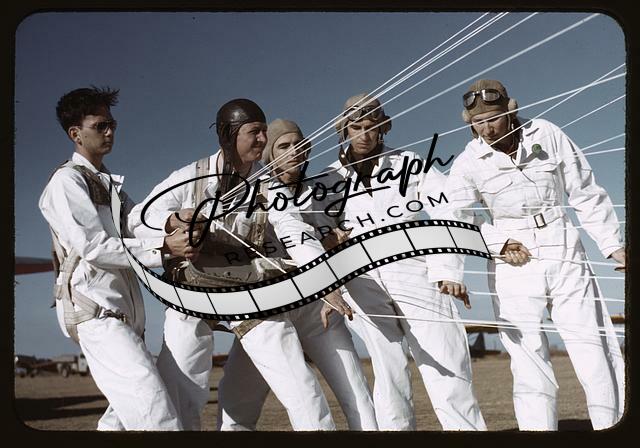 Title: Instructor explaining the operation of a parachute to student pilots, Meacham Field, Fort Worth, Tex.
