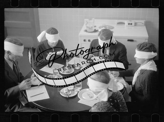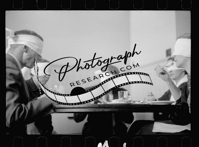 Men,Women,groups,blindfolded,eating,drinking,dining,tables,1935