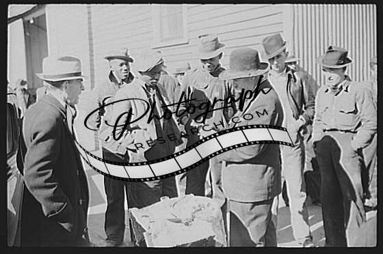 Title: Salesman displaying patent medicine to farmers who have brought tobacco to warehouse and are waiting outside for the sales to begin. Mebane, North Carolina