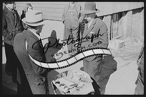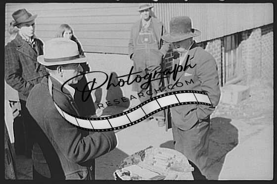 Title: Salesman displaying patent medicine to farmers who have brought tobacco to warehouse and are waiting outside for the sales to begin. Mebane, North Carolina