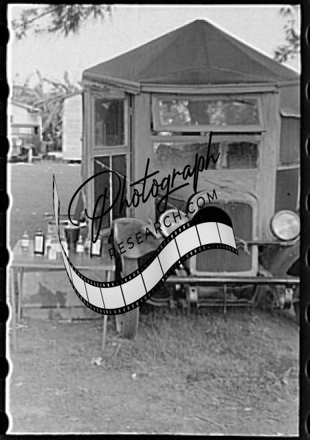 Title: One-legged medicine man encamped with the migrant fruit and vegetable workers at Belle Glade, Florida