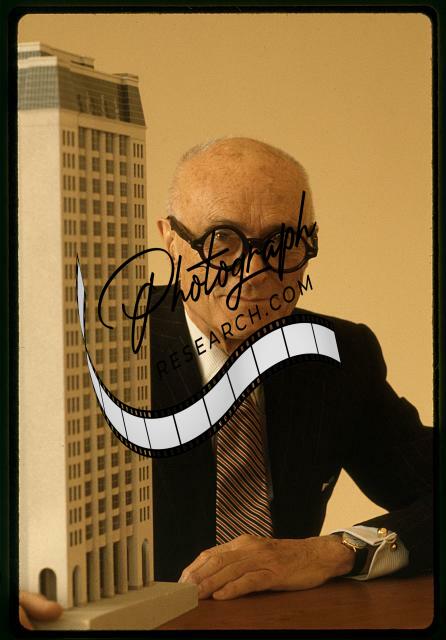 Philip Johnson, half-length portrait, seated next to one of his architectural models
