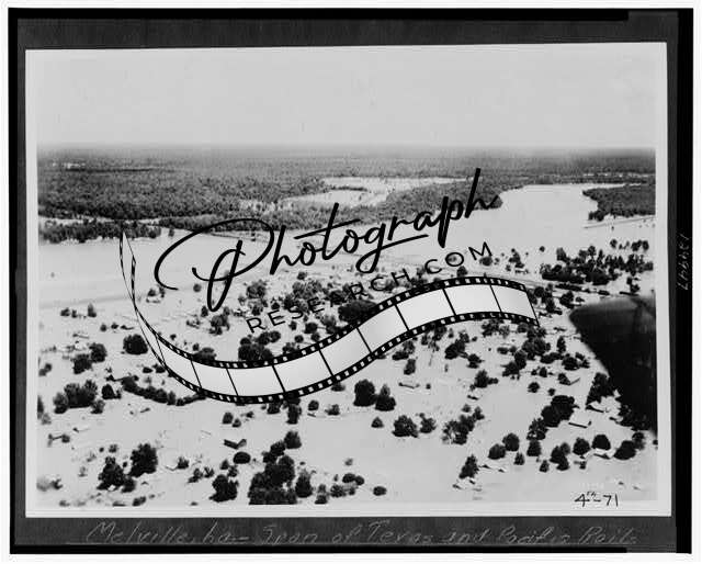 Summary: Aerial view of Melville, Louisiana and surrounding area, ruptured levee with floodwaters partially submerging the city and its environs, center section of railroad bridge has been swept away.