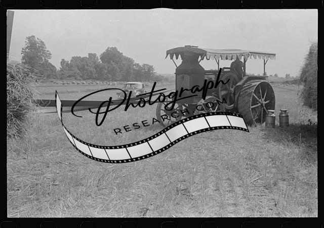 Gasoline tractor furnishing power for threshing,central Ohio,OH,Summer 1938