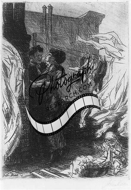Love on the roof,1914,John Sloan,Clothesline,Laundry,Romance,Couple Embracing